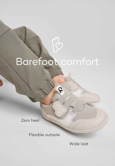 The ReimaTec barefoot waterproof sneaker Tallustelu keeps kids' feet dry and happy. The minimalist last is wide enough for all the toes to grow straight, and the sole is entirely without heel drop, so kids can experience a more natural stance and undisturbed gait. The sole is thin, only 4 mm, and flexible, which allows for better sensing of the ground and activates the muscles of the foot. With comfortable, removable insoles and easy elastic laces, this award-winning shoe is first choice for barefoot comfort in changing weather.
