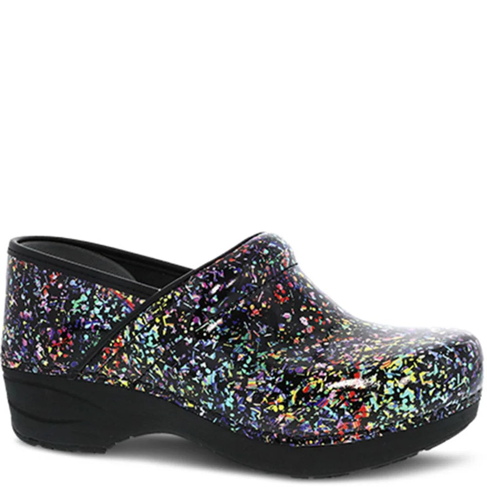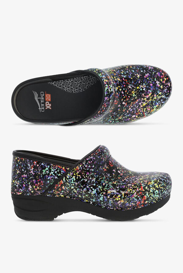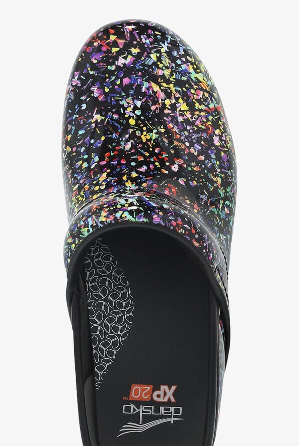 Dansko XP 2.0 Color Pop Patent Leather Nursing Clogs are accepted by the American Podiatric Medical Association. Designed for comfort and support from roomy toe box to memory foam insole to protective heel counter. The rocker bottom keeps you moving, fights fatigue and is slip and oil resistant. These bright color spots on silver black background will enlighten your work attire.