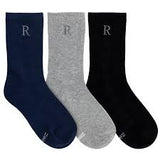 Three pairs of ribbed kid's crew socks in grey, navy, and tan with a knitted Robeez logo on the bottom and a seamless toe seam that provides all-day comfort. A classic everyday staple, these neutral boy's crew socks are designed to stay up through all their childhood adventures.