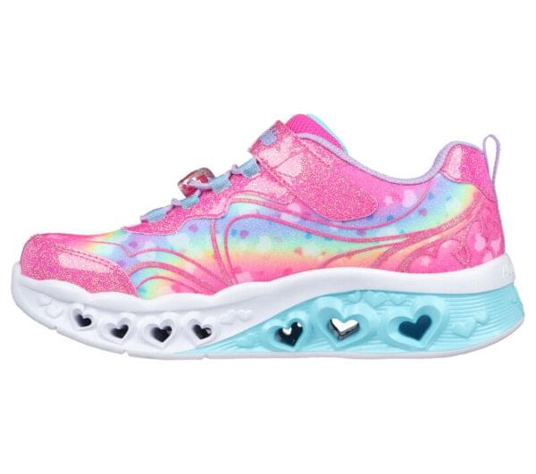 Brighten your steps with heart-filled style wearing Skechers Flutter Heart Lights® – Groovy Swirl. This lighted design features a multicolor glitter print fabric upper with synthetic glitter overlay, stretch laces with heart charm, and adjustable instep strap.