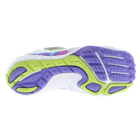 A low profile and a foot-hugging fit bring sporty, sprinter style to a machine-washable sneaker designed with a lightweight, barefoot feel. Elastic laces and a hook-and-loop bridge strap make it easy to put on and take off, while a sturdy heel cup and a grippy rubber tread provide stability and traction in any activity.
