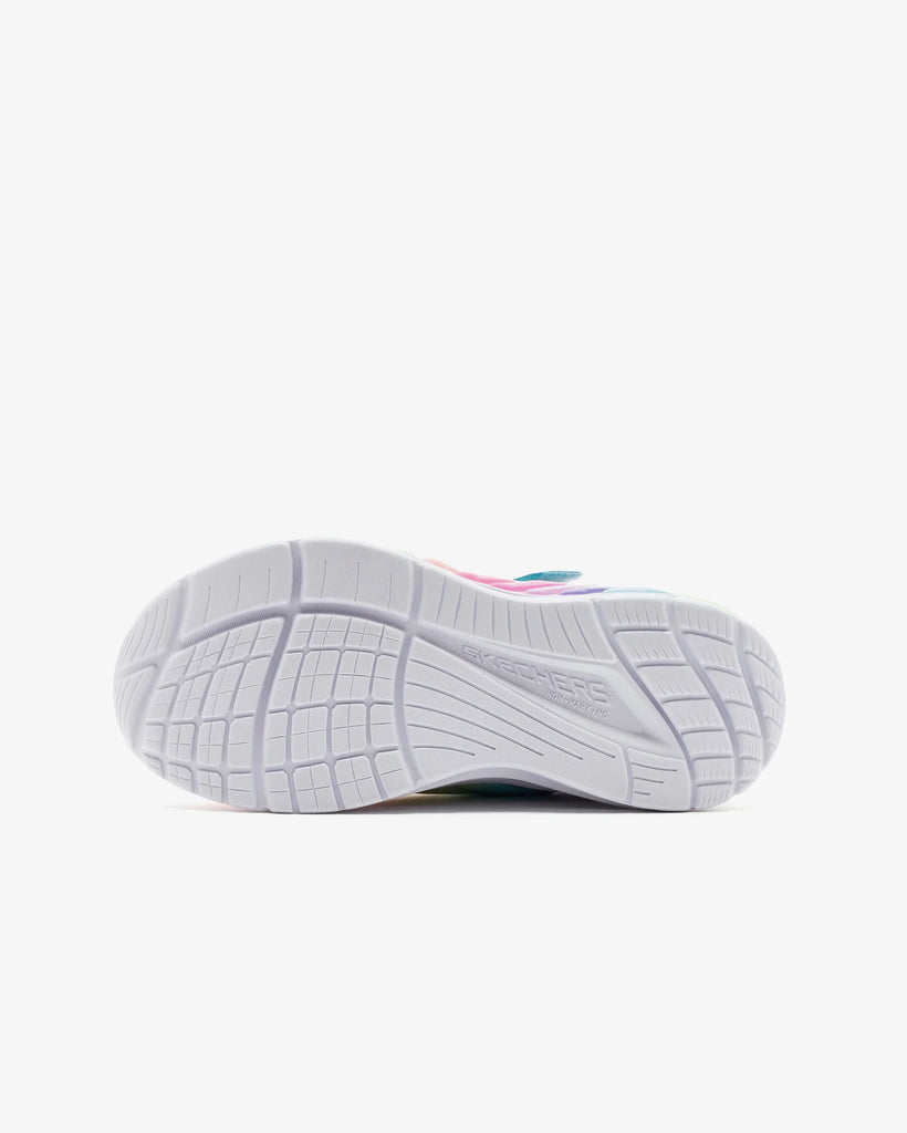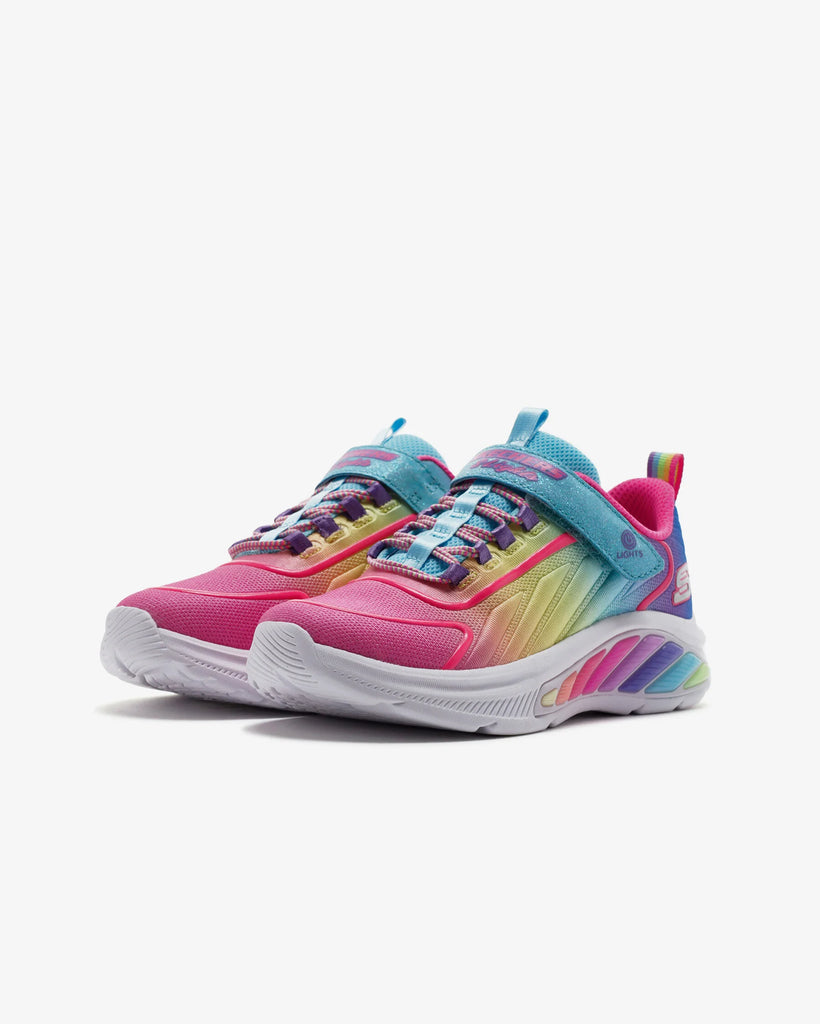 Shine bright in style the colorful Skechers Rainbow Cruisers. This lighted design features an ombre woven upper with stretch laces and an instep strap with an on/off button.