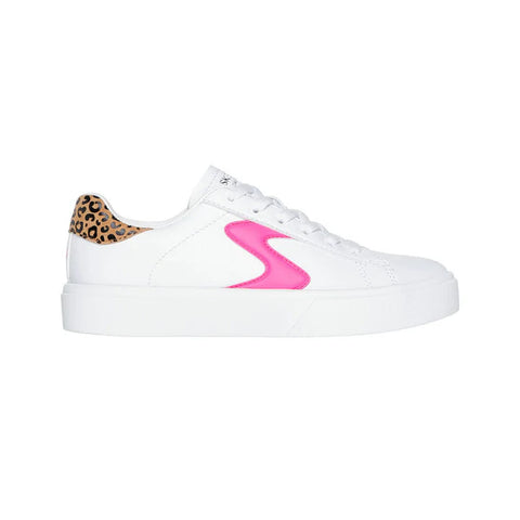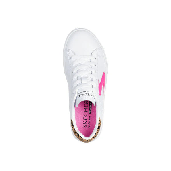 Bring the kids in on the clean, court style trend with Skechers Eden LX. This comfortable lace-up features a synthetic duraleather upper with modern 'S' quarter logo, leopard print collar detail, and a cushioned Skechers Air-Cooled Memory Foam® insole.