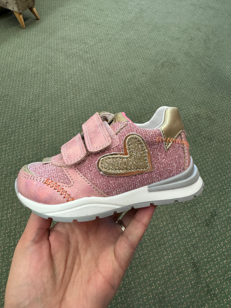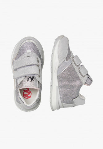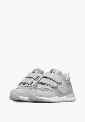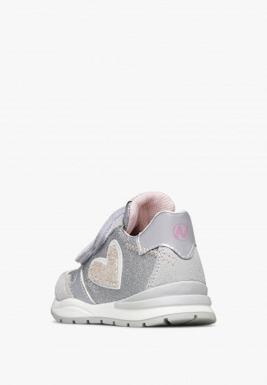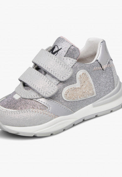 This new sneaker by Naturino combine a real lunar glamour with romantic touches. The upper in breathable mesh and glittered leather is embellished with a large heart on the side, featuring a patent leather edging. Designed for the needs of the most the most delicate little feet, they offer a comfortable fit with double Velcro, leather insole and rubber sole with contrasting spoiler under the heel.