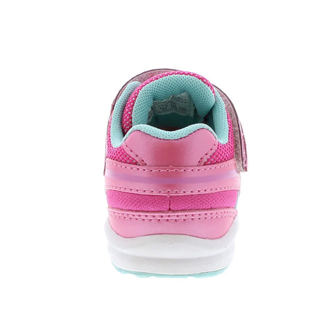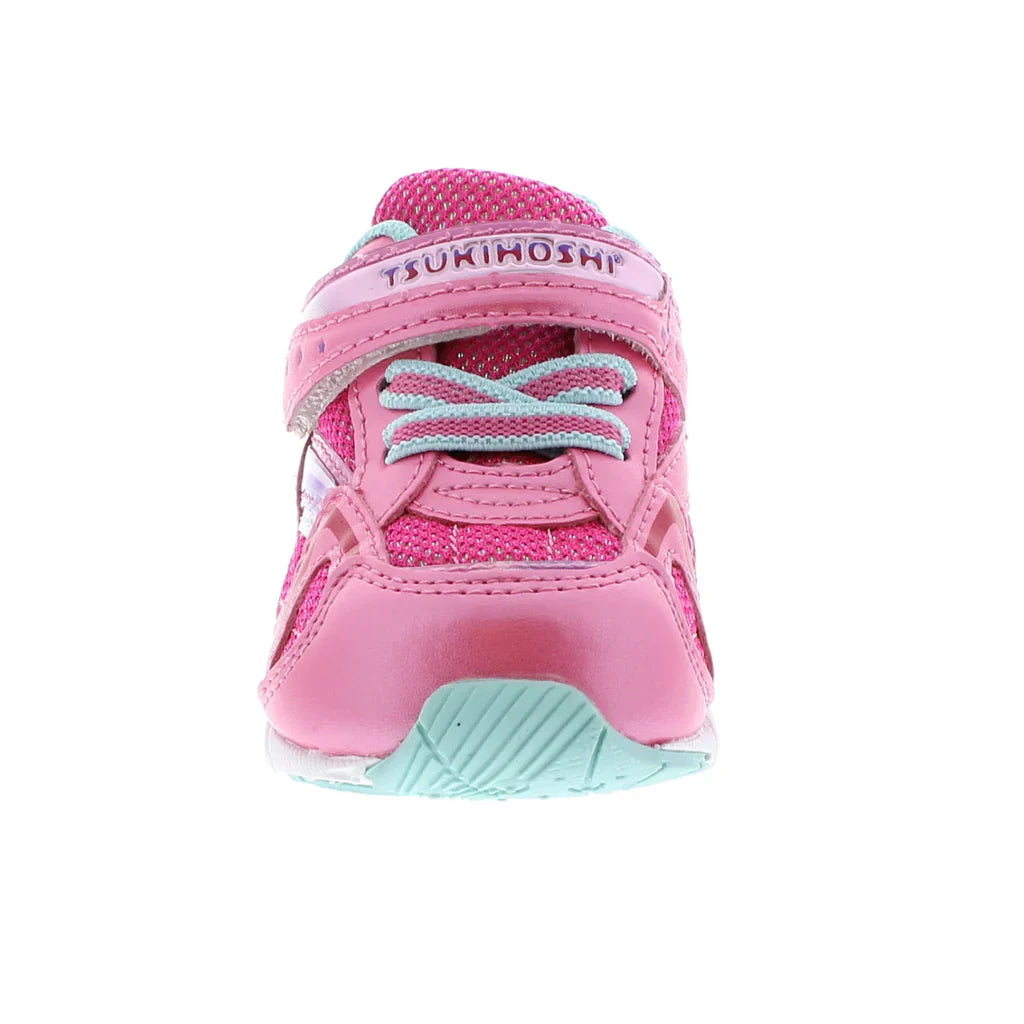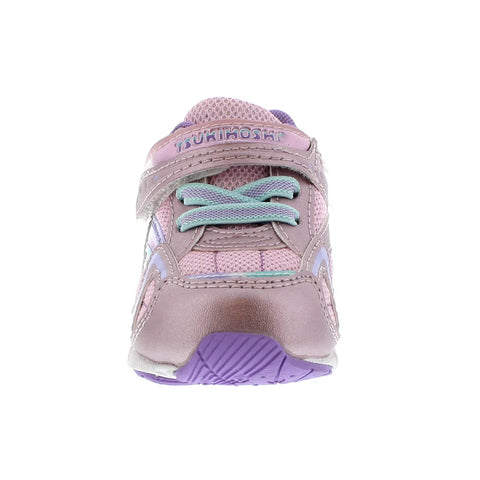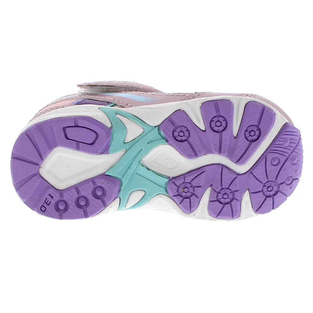 Bright, shimmery hues bring instant-favorite appeal to a machine-washable kids' sneaker designed with a lightweight, barefoot feel. Elastic laces and a hook-and-loop bridge strap make it easy to put on and take off, while a sturdy heel cup and a grippy rubber tread provide stability and traction in any activity.