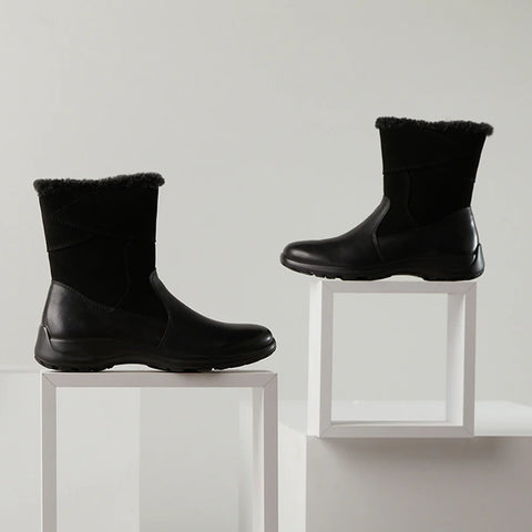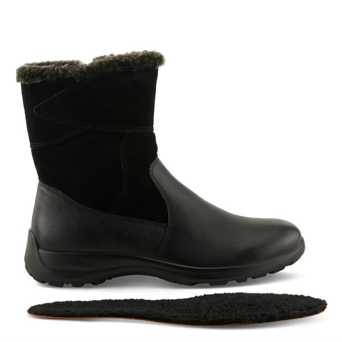Take on the elements in comfort and style with these Flexus by Spring Step. Leather and suede slip-on bootie with unique pattern piecing.