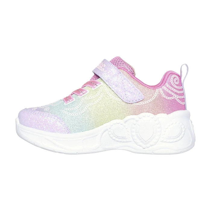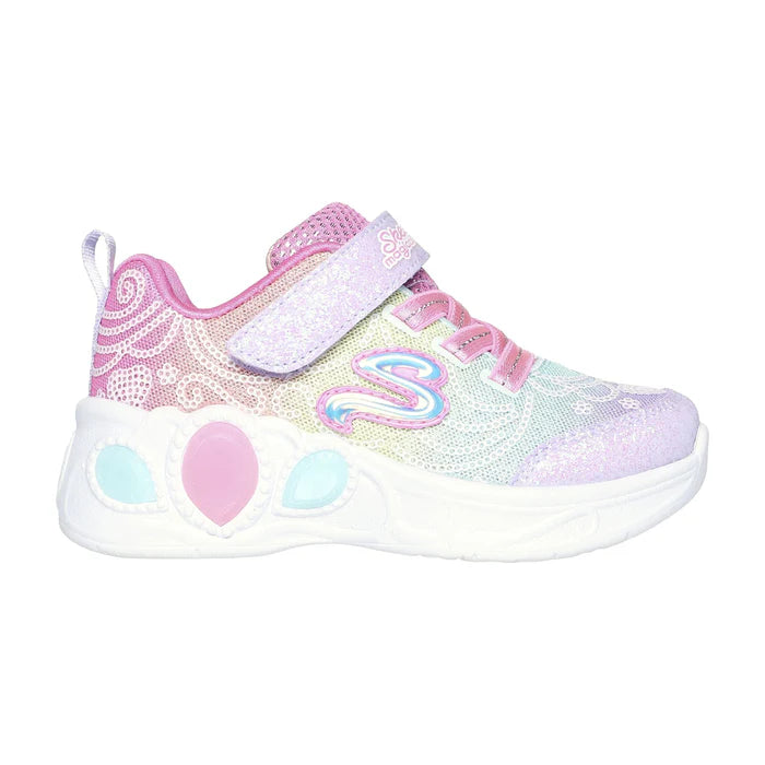 Light up your steps with royally cute style in Skechers S-Lights®: Princess Wishes. This sporty Magical Collection® themed design features a glittery mesh and sequin embellished upper with stretch laces, adjustable instep strap, cushioned comfort insole, and a light-up midsole.