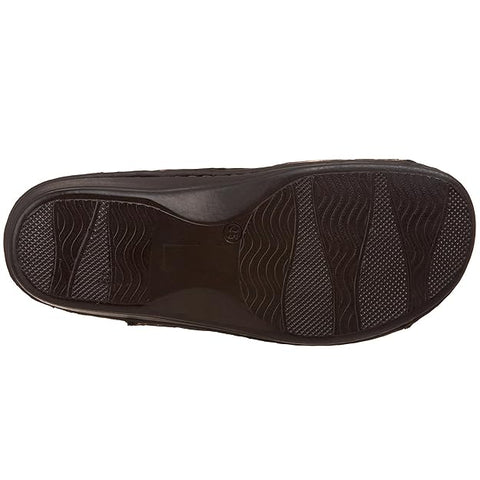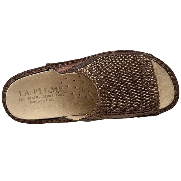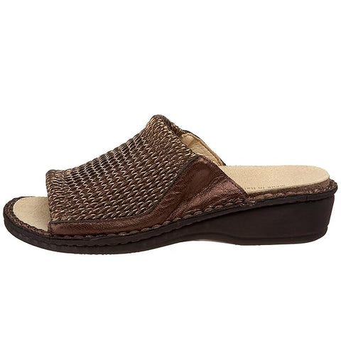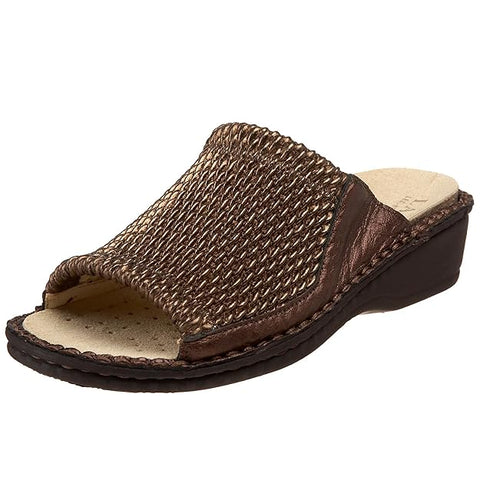 The flexible leather upper of these shoes is designed to fit many foot widths. The footbed is removable to accommodate orthotic insoles and the slight wedge to the sole makes them ultra comfortable and stylish. Open toe