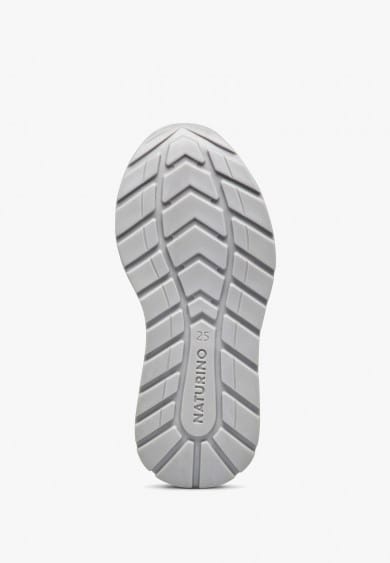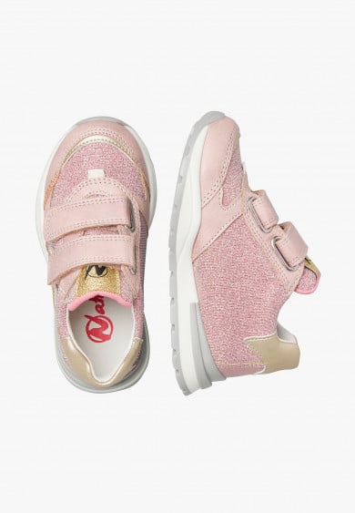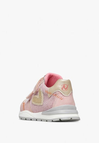 Sport sneaker with fabric and leather on tone upper complemented by silver glitter side heart. Construction features a double strap closure, leather and fabric lining, leather insole. Rubber running bottom.