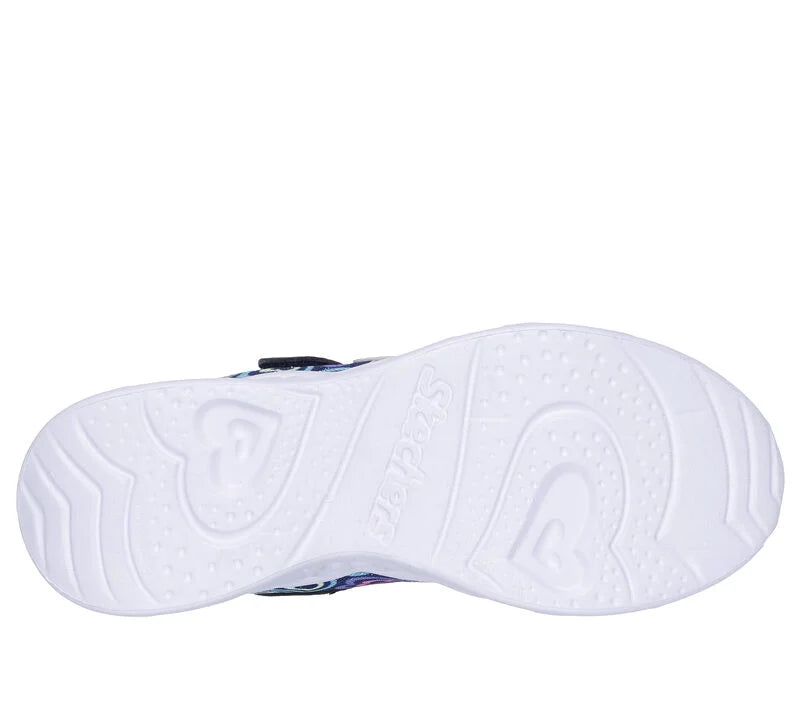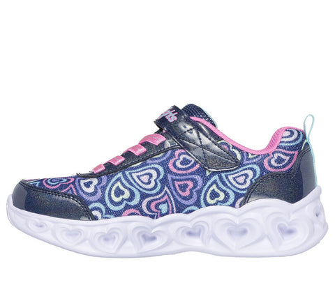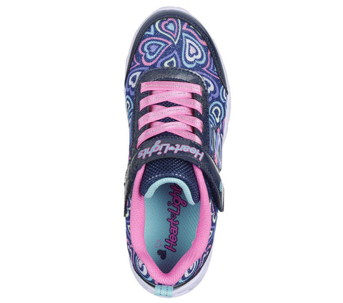 Delight them with the twinkling fun of Skechers Heart Lights - Boogie Love. This colorful sneaker features a sparkly, heart-printed synthetic upper with fixed stretch laces and Adaptive Closure, plus a heart-sculpted light-up midsole.