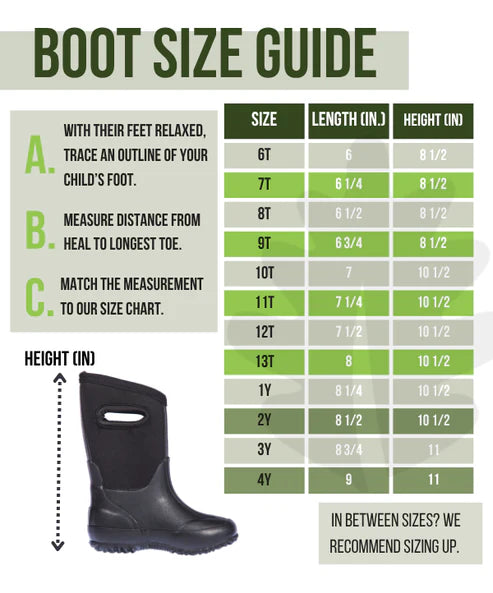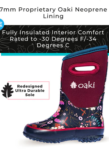 Oaki neoprene boots are built for everything from muddy backyard play to snowy mountain hikes. With a 7mm proprietary neoprene lining and fully insulated interior, they keep little feet warm and dry down to -30°F (-34°C). The ultra-durable ox-tendon sole provides excellent grip and resists wear. With slip-resistant tread, pull-on handles, and an easy-to-clean surface, these boots are practical for parents and fun for kids. Built to last, they’re made to be handed down — again and again.