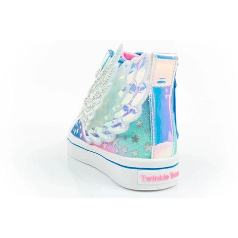 Soaring style shines with magical fun in Skechers Twinkle Toes®: Twi-Lites 2.0 - Dreamy Wings. This lighted high-top lace-up features a synthetic glitter finish upper with a wing tech piece, medial zipper, cushioned comfort insole, and a rhinestud embellished toe cap.