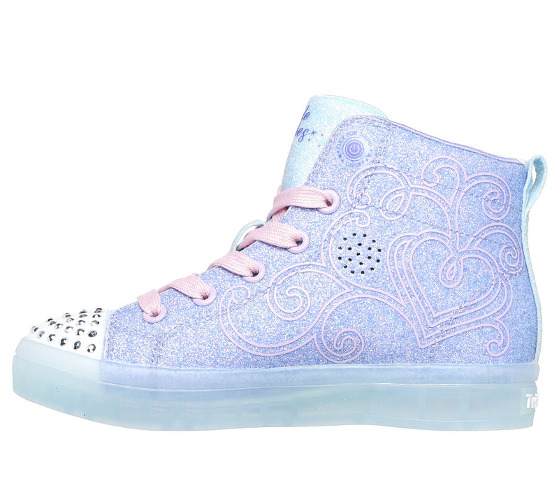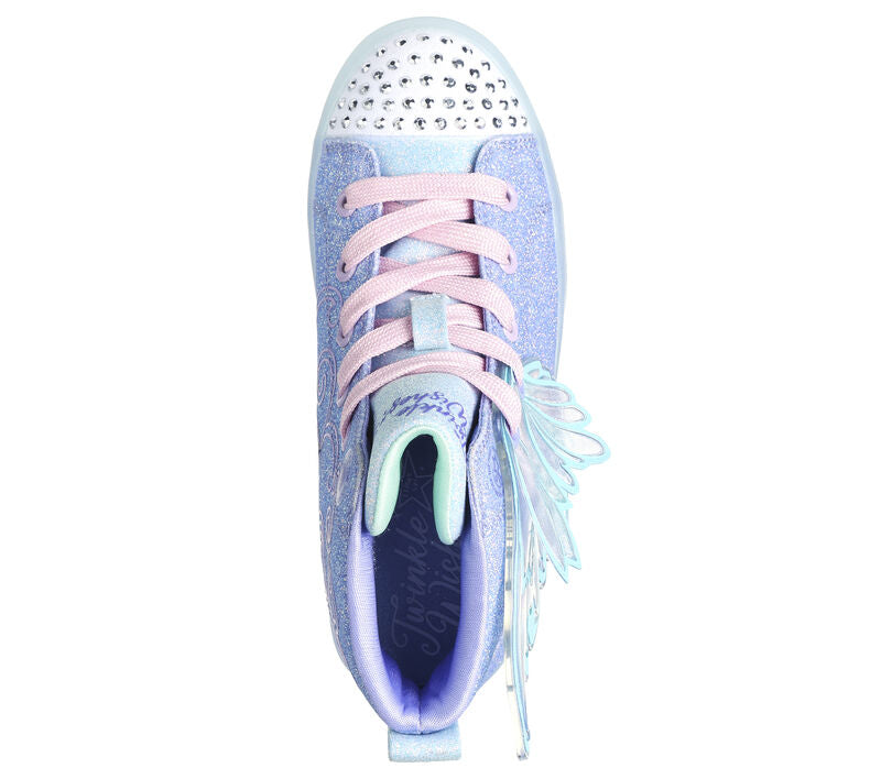 Sprinkle your day with magical fairy dust fun wearing Skechers Twinkle Toes®: Twi-Lites 2.0 - Twinkle Wishes. This high-top lace-up features a synthetic glitter finish upper with a light-up fairy wing tech piece, step and wand-activated sounds, plus a rhinestud embellished toe cap. Magnetic sound-activating wand is included as a gift with purchase.